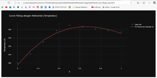 Saya telah memperoleh hasil visualisasi kontur perpindahan panas pada batang dan mengekspor datanya dalam format .csv. Selanjutnya, saya menggunakan bantuan AI ChatGPT untuk melakukan curve fitting. Saya meminta ChatGPT untuk menghasilkan output dalam bentuk berkas .html. Setelah menerima berkas tersebut, saya mengunduhnya dan membukanya di browser. Berkas .html ini berisi skrip JavaScript yang, ketika dibuka di browser, secara otomatis menampilkan grafik sesuai dengan instruksi dalam programnya.