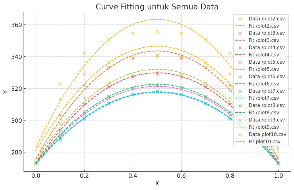 Pada saat mengerjakan simulasi ini, sebagian besar saya hanya mengikuti petunjuk yang diberikan dalam mengerjakan simulasi konduktivitas termal pada sebuah bidang 2D menggunakan aplikasi CFDSOF. Saat mengerjakan menggunakan aplikasi tersebut, saya tidak memiliki masalah dan bisa mendapatkan grafik kontur serta plot XY dari hasil simulasi konduktivitas termal pada bidang 2D. Masalah mulai muncul ketika saya ingin melakukan curve fitting menggunakan OpenAI. Ketika saya menginput file csv yang saya dapatkan dari CFDSOF ke OpenAI, seringkali terjadi kendala dalam pembacaan file karena formal yang cukup aneh. Data yang diberikan dimasukkan dalam satu sel, sehingga OpenAi tidak bisa menentukan variabel X dan Y dari file yang saya berikan. Saya perlu melakukan prompt berulang agar OpenAi dapat mengolah file csv tersebut. Ketika file csv bisa diolah dan menghasilkan grafik curve fitting yang saya inginkan, saya meminta OpenAi untuk membuatkan kode untuk visualisasi grafik curve fitting tersebut. Pada prompt pertama, hasil kode yang diberikan sangat kurang memuaskan. Saya mencoba menambahkan beberapa info yang sebenarnya sudah diolah oleh OpenAi untuk mendapatkan foto grafik curve fitting. Namun, hal tersebut masih sulit diolah oleh OpenAi sehingga saya menyerah untuk melakukan rantaian prompt. Saya perlu melakukan prompt ulang dari awal untuk memperbaikinya.