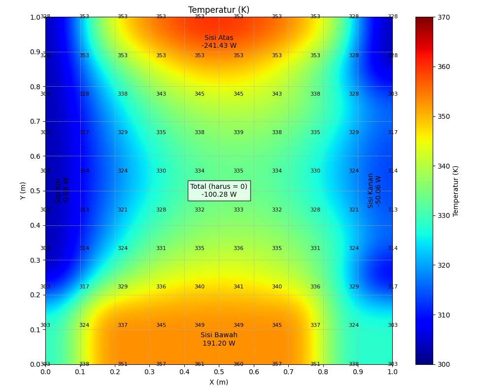 Heat map ini menunjukkan distribusi energi panas (W) yang dibagi menjadi grid 12×12. Kontur warna merepresentasikan intensitas energi panas, dengan warna merah pekat menunjukkan nilai energi panas tertinggi dan warna biru tua menunjukkan nilai energi panas terendah. Dapat dilihat pada heat map ini, sisi atas memiliki energi panas keluar sebesar -241.43 W, sedangkan sisi bawah menerima 191.20 W. Sisi kiri dan kanan juga menunjukkan fluks panas keluar tetapi dengan nilai lebih kecil. Heatmap cukup sesuai dengan kondisi sempadan yang kita input pada simulasi, yaitu W3 dengan suhu sekitar 373 K dan W4 sekitar 353 K.
