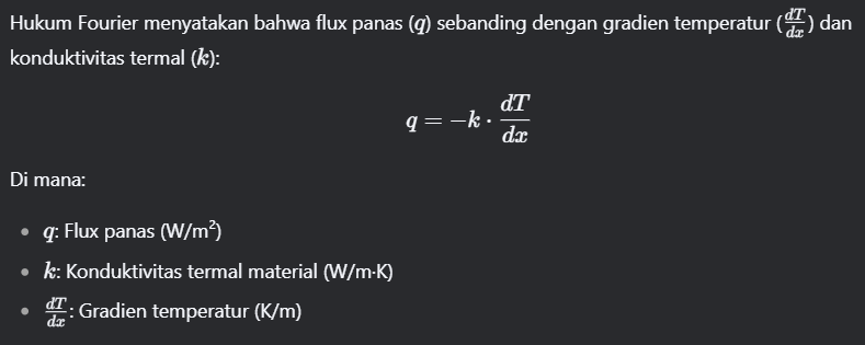 - Flux panas (qq) dihitung menggunakanย Hukum Fourier, yaituย q=โkโ dTdxq=โkโ dxdTโ, di manaย kkย adalah konduktivitas termal danย dTdxdxdTโย adalah gradien temperatur.