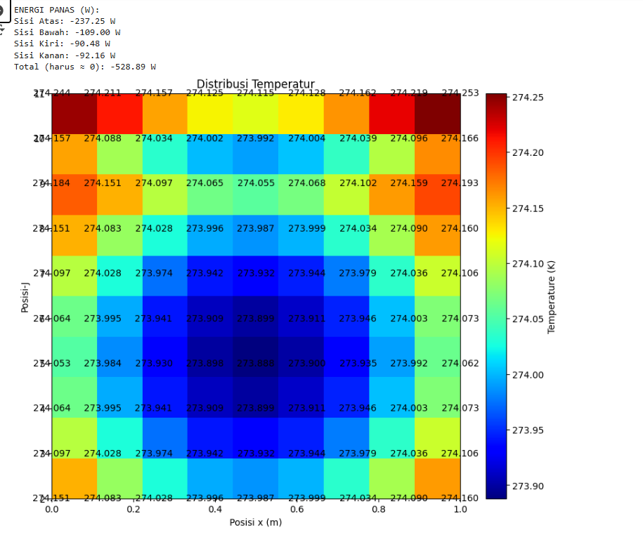 - Biru Tua (273.90 K): Area terdingin, kemungkinan besar menunjukkan titik di mana panas dialirkan keluar atau tidak ada sumber panas signifikan. Ini terletak di tengah permukaan, yang konsisten dengan pola simetri sebelumnya (seperti pada posisi-J tengah).