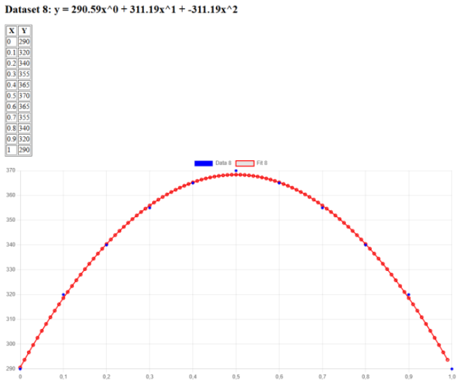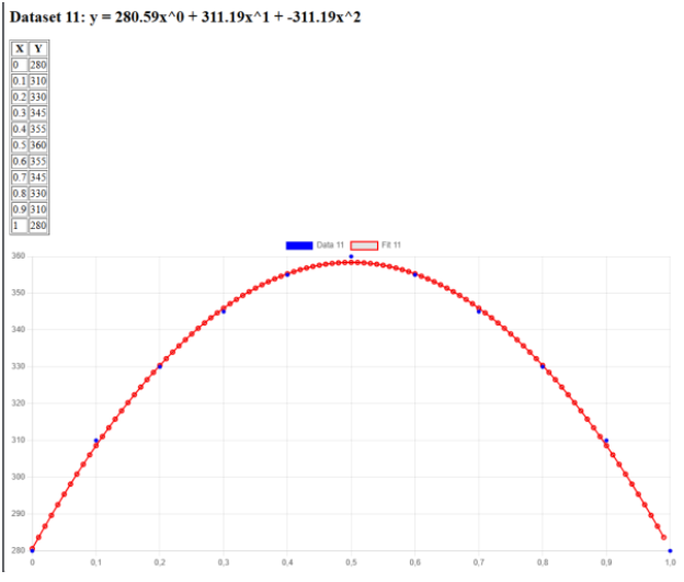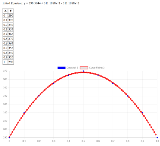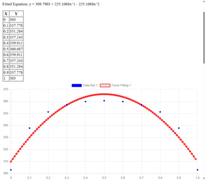Maka dari itu, akan didapatkan sistem persamaan linier yang akan diselesaikan menggunakan metode Gauss-Jordan menggunakan library seperti numeric.js. Outputnya adalah kurva curve fitting plot yang dapat digunakan untuk melihat distribusi temperature pada tiap baris J. Selanjutnya akan dilakukan pembuatan visual heatmap berdasarkan beberapa persamaan di bawah ini: