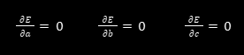 Nilai parameter a, b, dan c diminimalkan menggunakan turunan parsial untuk setiap parameter