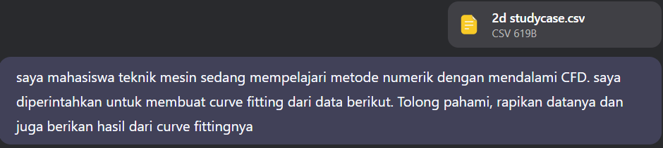 Step selanjutnya adalah membuat curve fitting dengan menggunakan bantuan AI. Disini saya menggunakan platform DeepSeek untuk membantu saya mendapatkan garfik curve fittingnya. Untuk memudahkan proses pembuatan curve fitting, saya meminta AI untuk merapihkan datanya terlebih dahulu lalu meminta hasil curve fitting melalui coding dan membuka hasil codingnya menggunakan Google Colabs. Berikut adalah prompt saya serta hasil grafik curve fitting dari data sebelumnya :