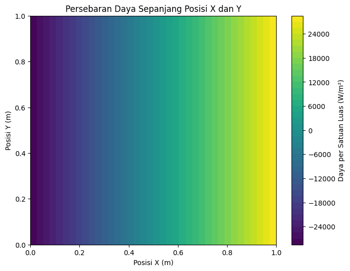 Untuk Selanjutnya, saya mencari Visualisasi Persebaran Daya yang dilakukan dengan membuat grid 2D untuk x dan y, lalu menghitung persebaran daya q(x,y) untuk setiap titik pada grid. Hasilnya divisualisasikan menggunakan contour plot atau heatmap. Berikut adalah persamaan dari persebaran daya q(x,y) :