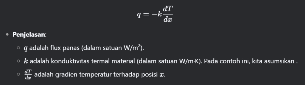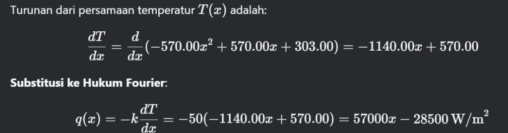 Disini saya akan menghitung persamaan flux panas dari persamaan temperatur yang telah didapat dengan rumus Hukum Fourier untuk konduksi panas seperti dibawah :