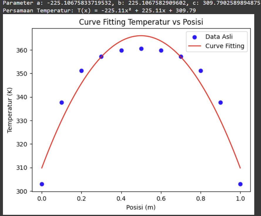 dan berikut adalah hasil dari Curve Fitting dari data yang telah diberikan dengan persamaan temperaturnya adalah T(x)=−570.00x2+570.00x+303.00 :