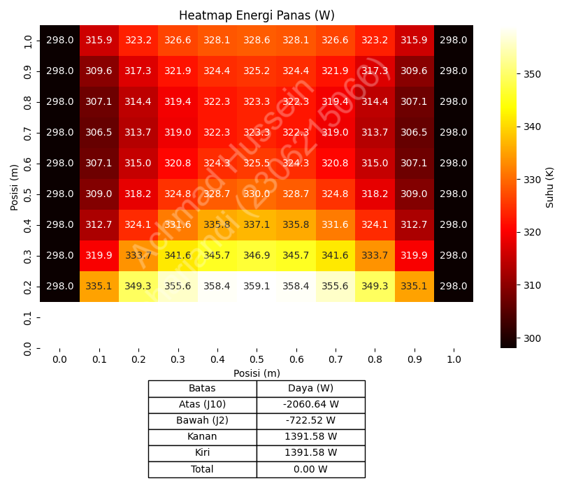 Pada heatmap tersebut terlihat ada baris yang kosong dikarenakan saya hanya menyimulasikan 9 baris (J2-J10). Persebaran panas bisa dilihat pada diagram dengan membaca legenda di sampingnya. Hasilnya daya di batas atas adalah -2060.64 W, di batas bawah -722.52 W, dan di kanan dan kiri masing-masing adalah 1391.58 W. Totalnya adalah 0 sesuai dengan hukum kekekalan energi.