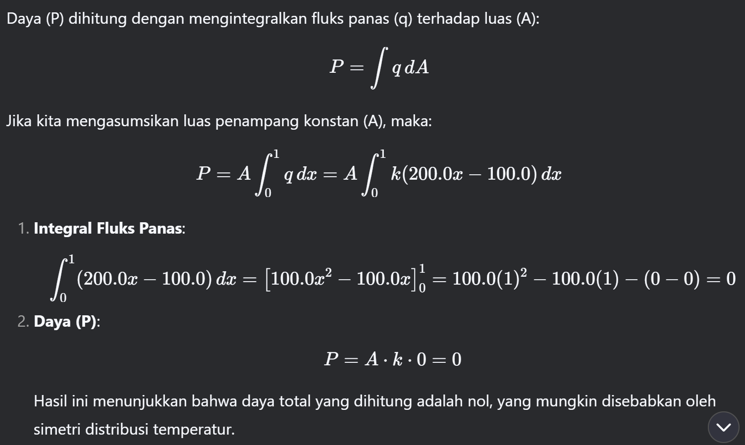 Setelah memiliki pemikiran awal, saya menyempurnakan ide-ide tersebut dengan mempertimbangkan detail-detail teknis. Misalnya, untuk curve fitting, saya memastikan bahwa persamaan yang dihasilkan akurat dan sesuai dengan data yang diberikan. Untuk menghitung fluks panas, saya memastikan bahwa konduktivitas termal (kk) dan turunan persamaan temperatur dihitung dengan benar. Selanjutnya, untuk menghitung daya, saya memastikan bahwa integrasi dilakukan dengan batas yang tepat dan mempertimbangkan asumsi-asumsi yang relevan, seperti distribusi temperatur yang simetris.