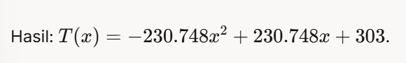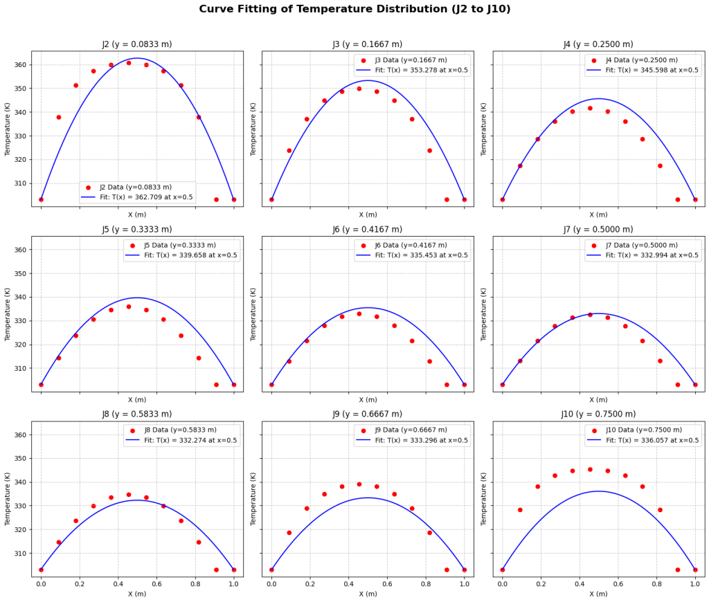 Melakukan fitting polinomial derajat 2 (T(x)=a+bx+cx2) untuk setiap baris (J2 hingga J10) berdasarkan posisi x, dimana x =[0,0.0833,0.1667,0.25,0.3333,0.4167,0.5,0.5833,0.6667,0.75,0.8333,1]. Saya menggunakan coding phyton berupa numpy. polyfit untuk fitting polinomial derajat 2