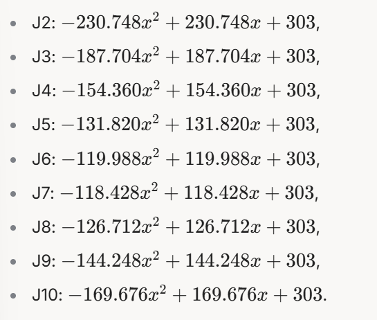 Setelah code diatas dijalankan di Google Collab maka akan didapatkan persamaan polinomial yang telah dilakukan fitting untuk J2-J10. Hasil fittingnya sebagai berikut: