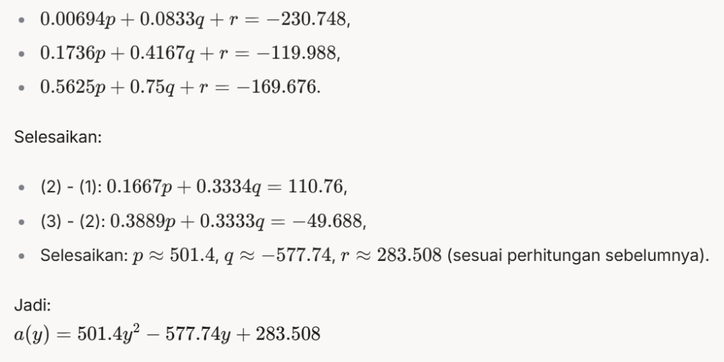 Setelah mendapatkan persamaan T(x), saya melakukan proses fitting koefisien a(y) yang merupakan fungsi dari y sebagai polinomial derajat 2 sebagai berikut: