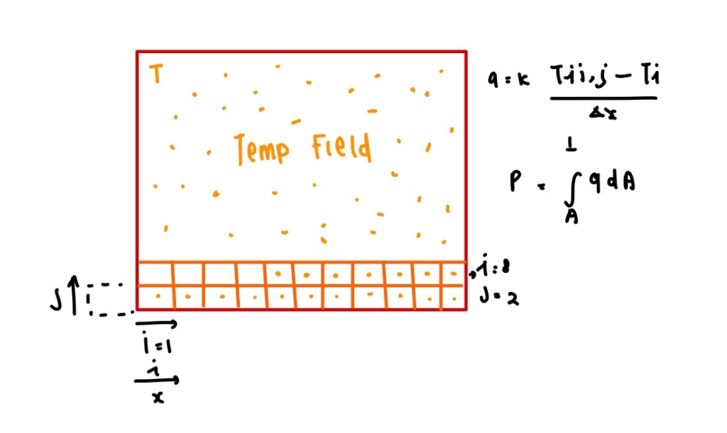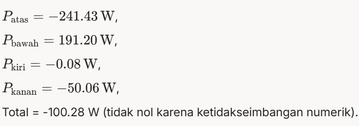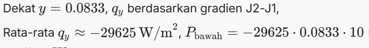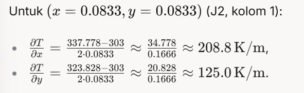Dari data hasil simulasi didapatkan suhu pada tepi konstan 303 K maka gradien pada tepi permukana dapat diasumsikan nol kecuali pada boundary conditionnya. Perhitungan menggunakan rumus diatas dilakukan untuk semua titik kecuali tepi, berikut adalah penjabaran pehitungan untuk J2: