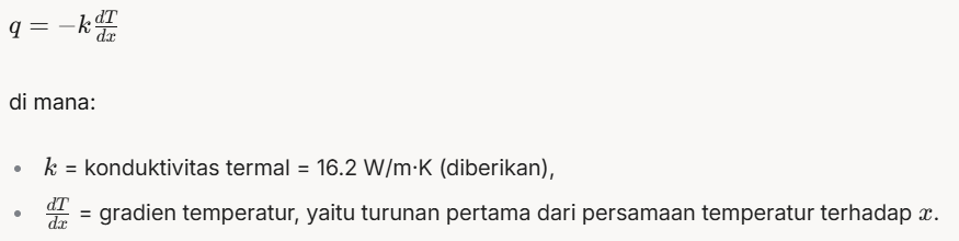 Fluks panas (q) dihitung menggunakan hukum konduksi panas Fourier: