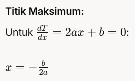 Karena a negatif dan b positif, titik maksimum berada di antara x=0 dan x=1 (lihat koefisiennya simetris). Mari kita asumsikan rentang x=0 x = 0 x=0 hingga x=1 meter untuk integral, dan A adalah luas penampang 1 m² .