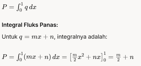 • Metode perhitungan daya: Daya dapat dihitung dengan mengintegrasikan fluks panas terhadap luas tertentu pada plat. Secara matematis, ini dinyatakan sebagai: