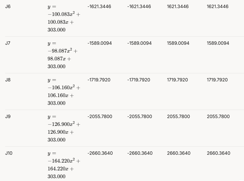 Plot J8: y = -106.160x^2 + 106.160x + 303.000