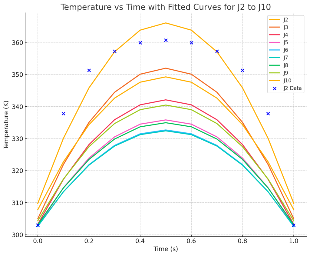Untuk menentukan koefisien a(y)a(y)a(y), kita menggunakan data suhu maksimum pada x=0.5x = 0.5x=0.5 untuk titik J2 hingga J10. Nilai a(y)a(y)a(y) yang diperoleh untuk setiap titik J adalah sebagai berikut: