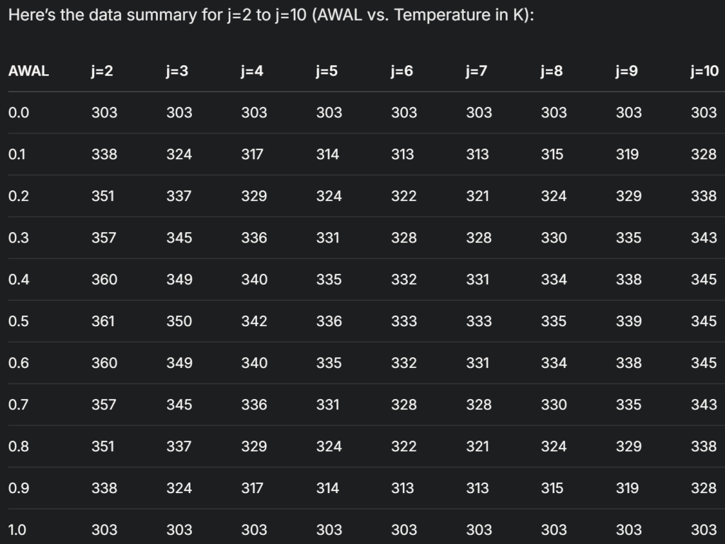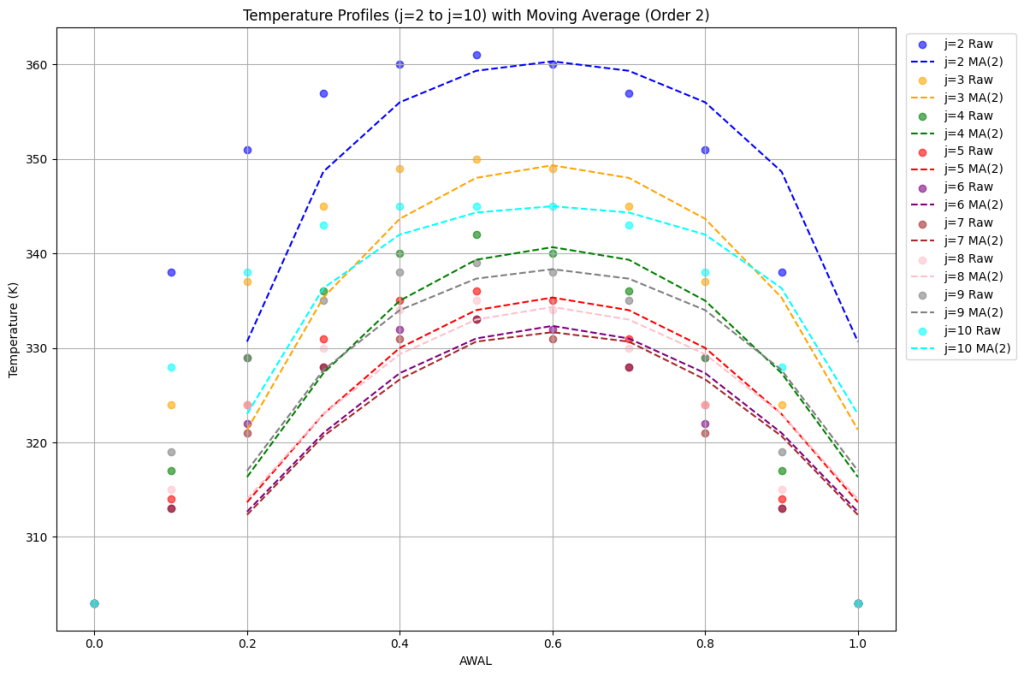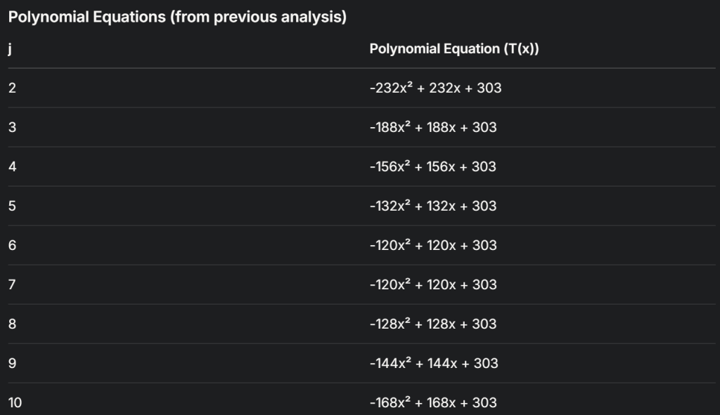 Setelah mendapatkan data-data yang diinginkan dari hasil simulasi, Saya melakukan prompting ke AI (Grok) dengan kalimat: “Terdapat j=2, j=3, j=4, j=5, j=6, j=7, j=8, j=9, j=10. Jadikan hal tersebut sebagai bagian dari kepala/judul data yang berada di bawah nya. analisis keseluruhan, buatkan persamaan polinomial nya, buatkan kurva polinomial dan moving average orde dua dengan adanya curve fitting.” Hal ini memunculkan hasil seperti berikut: