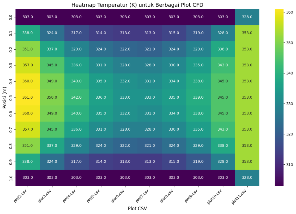 plt.title(‘Heatmap Temperatur (K) untuk Berbagai Plot CFD’, fontsize=14)