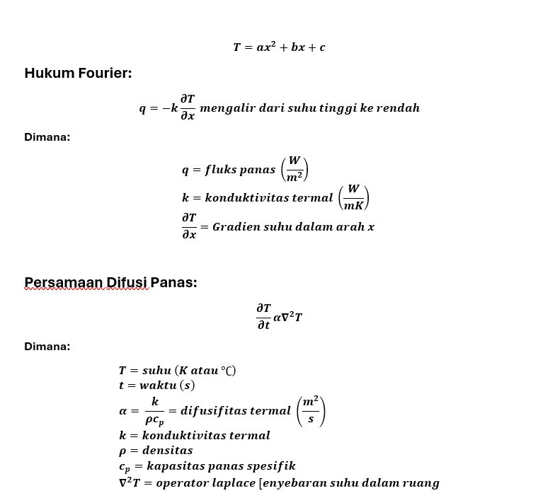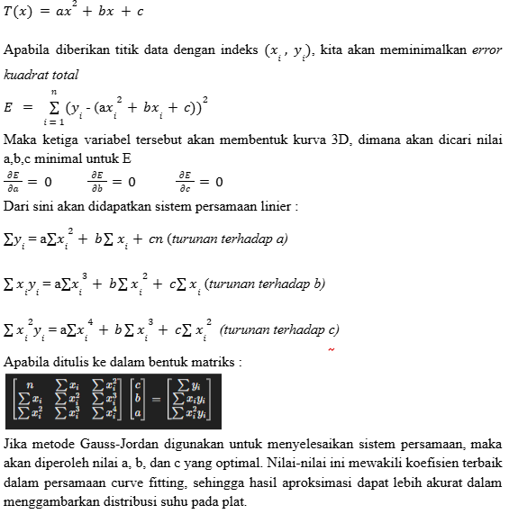 16. Relevance of Analysis, kasus ini akan dianalisis secara numerik menggunakan CFDSOF, yang menghasilkan data temperatur pada plat. Agar hasilnya lebih mudah dipahami dan aplikatif, diperlukan visualisasi yang informatif melalui curve fitting plot. Untuk itu, perlu dilakukan perhitungan koefisien a, b, dan c guna mendapatkan persamaan curve fitting yang paling sesuai dengan pola distribusi panas pada plat. Selain itu, heatmap dapat digunakan untuk melihat distribusi suhu secara lebih detail. Visualisasi ini didasarkan pada persamaan yang menggambarkan sebaran temperatur, yaitu: