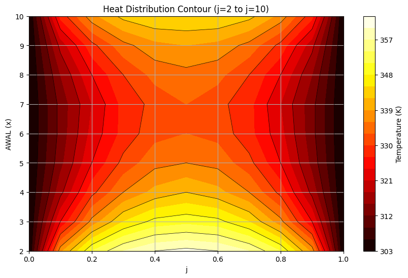 Terdapat sebuah distribusi panas pada sebuah plat berdimensi 1×1 m dengan adanya perbedaan panas di tiap sisi (303K, 373K, 353K) dan flux panas yang ada konduktivitas termal nya sebesar 16,2 W/mK sehingga diperlukannya visualisasi melalui grafik dan kontur panas agar terlihat distribusi panas yang bekerja dan mengalir pada sebuah plat tersebut.