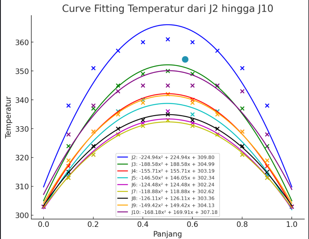Dalam tugas yang pernah saya lakukan, saya menggunakan metode curve fitting untuk menganalisis persebaran daya dalam sistem heat transfer berdasarkan data dari simulasi CFD-SOF. Hasil dari simulasi menunjukkan bahwa metode regresi least squares memberikan pendekatan yang lebih akurat dibandingkan interpolasi polinomial tinggi, yang cenderung mengalami ketidakstabilan numerik pada titik tertentu.