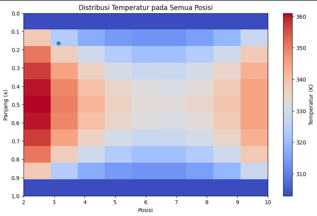 Dari grafik di atas, terlihat bahwa temperatur lebih tinggi pada sisi kiri dan mengalami penurunan ke arah kanan. Ini menunjukkan adanya gradien temperatur yang signifikan, yang berkontribusi terhadap pola penyebaran heat flux. Sesuai dengan hukum Fourier, heat flux berbanding lurus dengan gradien temperatur: