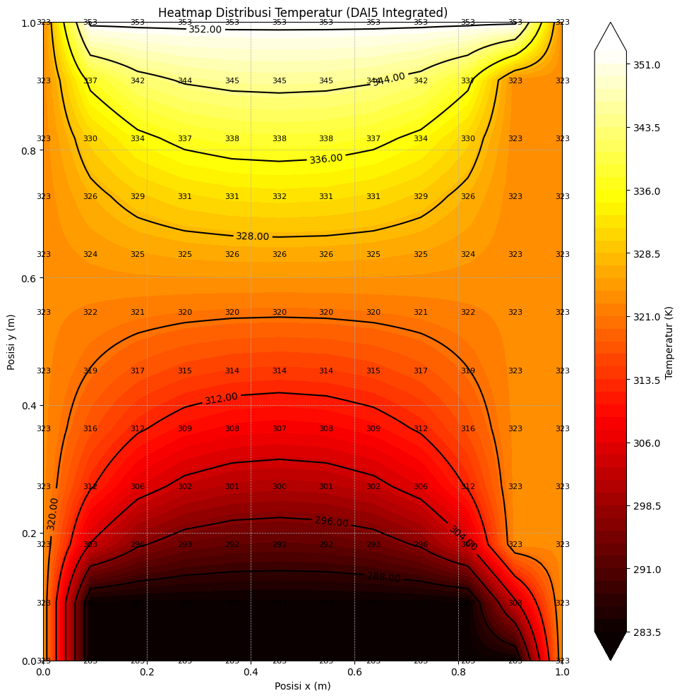 - Langkah-langkah dijelaskan secara logis: (1) masukkan data temperatur, (2) buat grid 12×12, (3) lakukan interpolasi, (4) buat heatmap, (5) hitung gradien dan fluks, (6) integrasikan untuk total daya.