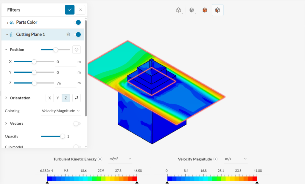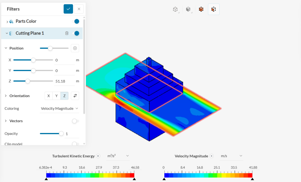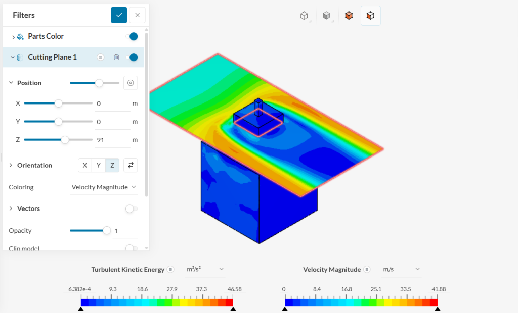 A horizontal cutting plane is shown at different elevations (approximately 100 m, 91 m, 76 m, and 51 m in the images). This approach highlights the velocity distribution at various heights above the building.