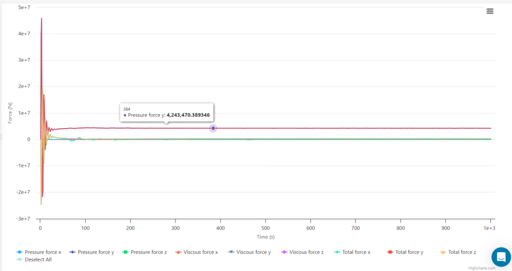2. Convergence to Steady State or Periodic Flow: The pressure force line appears to stabilize around a certain value (โ‰ˆ4.243ร—107\approx 4.243 \times 10^7โ‰ˆ4.243ร—107 N in the example shown), suggesting the flow field reaches a steady or quasi-steady condition.