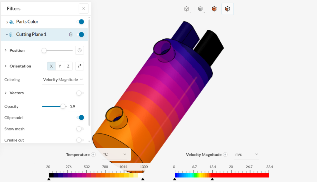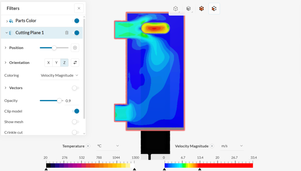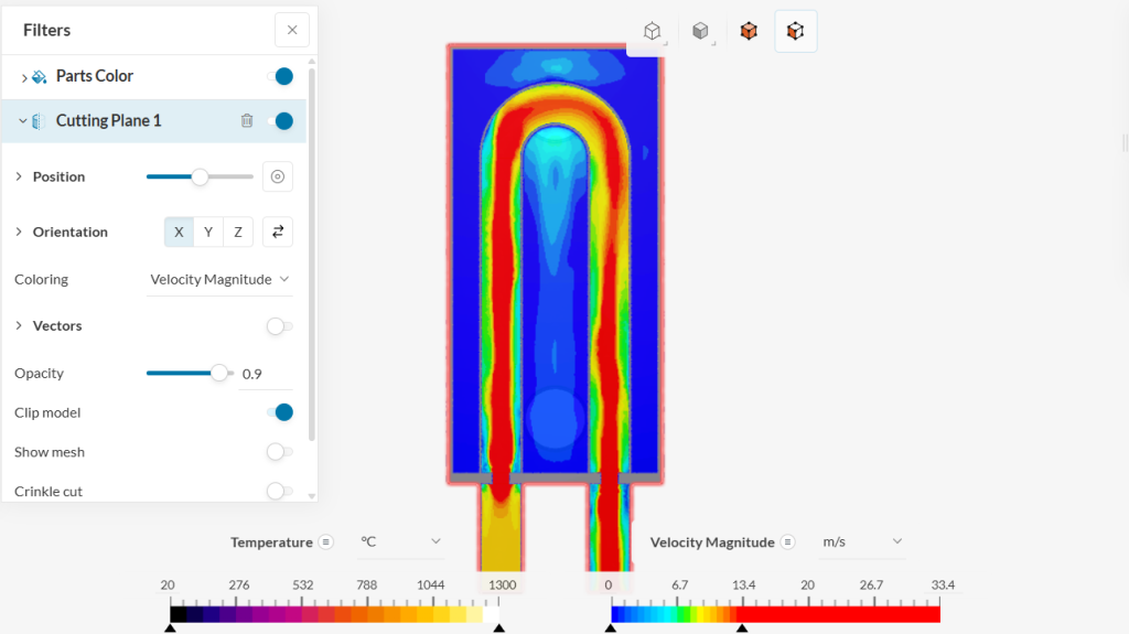 In the second simulation picture, is a horizontal cross-section perspective, the inlet and outlet ports positioned on the left side of the reactor. A high-temperature zone (approximately 1044ยฐC) is concentrated in the upper portion of this view. The velocity distribution shows higher values near the inlet ports (around 13โ20 m/s), with lower flow speeds in the main chamber.