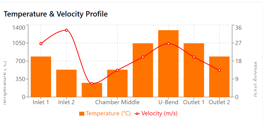 An interesting inverse relationship emerges between velocity and temperature in the middle chamber sections. As velocity decreases, temperature rises.