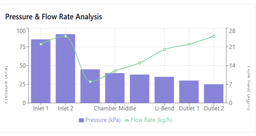 Pressure data indicates a steady drop from the inlets (85โ92 kPa) to the outlets (25โ30 kPa). Despite these changes, flow rates remain relatively stable between inlets and outlets (22โ25 kg/h).