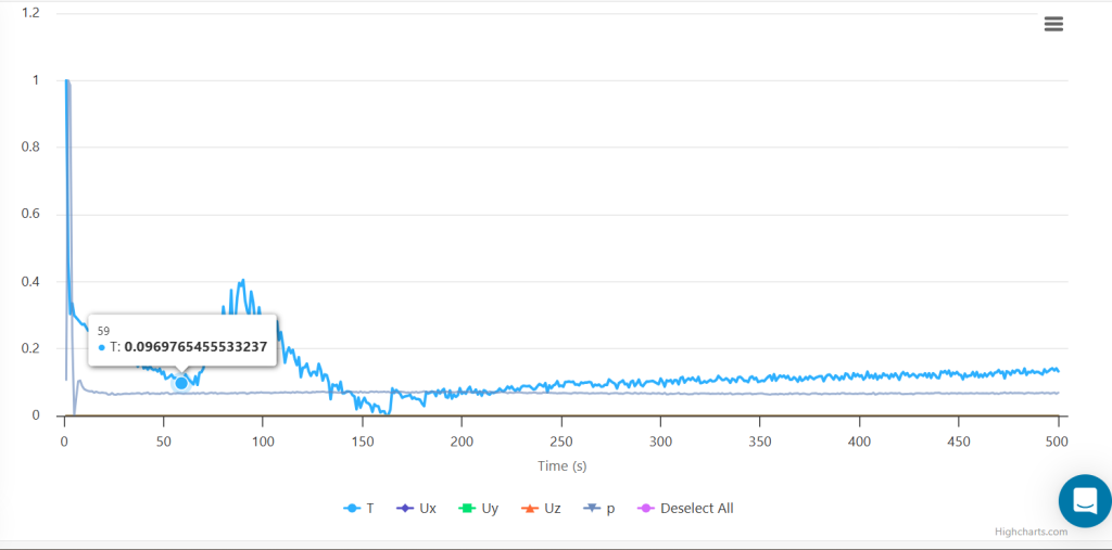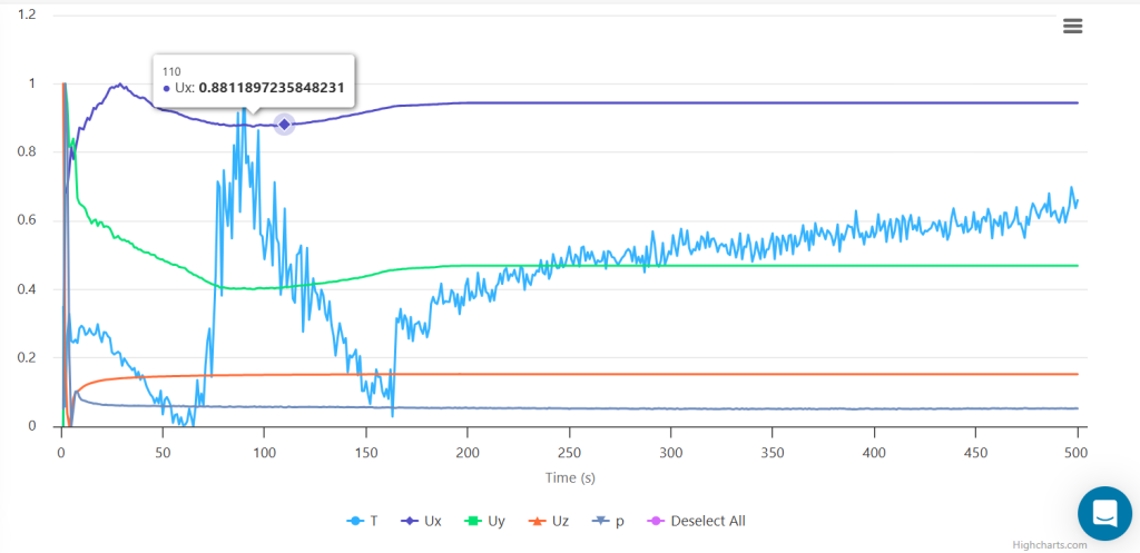 - The first two images show velocity (Ux, Uy, Uz), pressure (p), and temperature (T) over time.