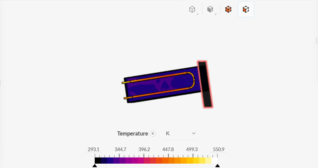 - The third image shows a temperature distribution of the heat sink model, with the color scale ranging from 293.1K (black) to 550.9K (white).