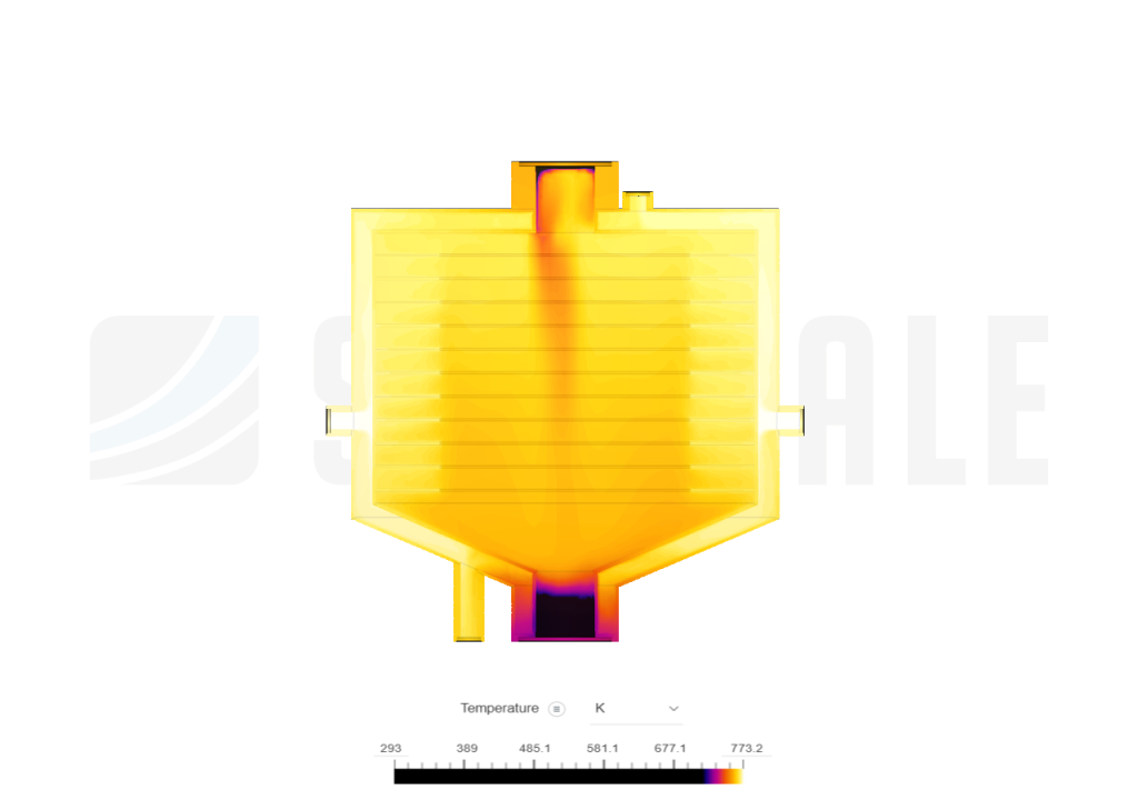 The thermal simulation results reveal significant temperature gradients within the system, particularly highlighting concentrated heat regions near the inlet and outlet sections. The observed thermal distribution suggests that heat transfer is occurring as expected, with the highest temperatures aligning with the primary flow paths.