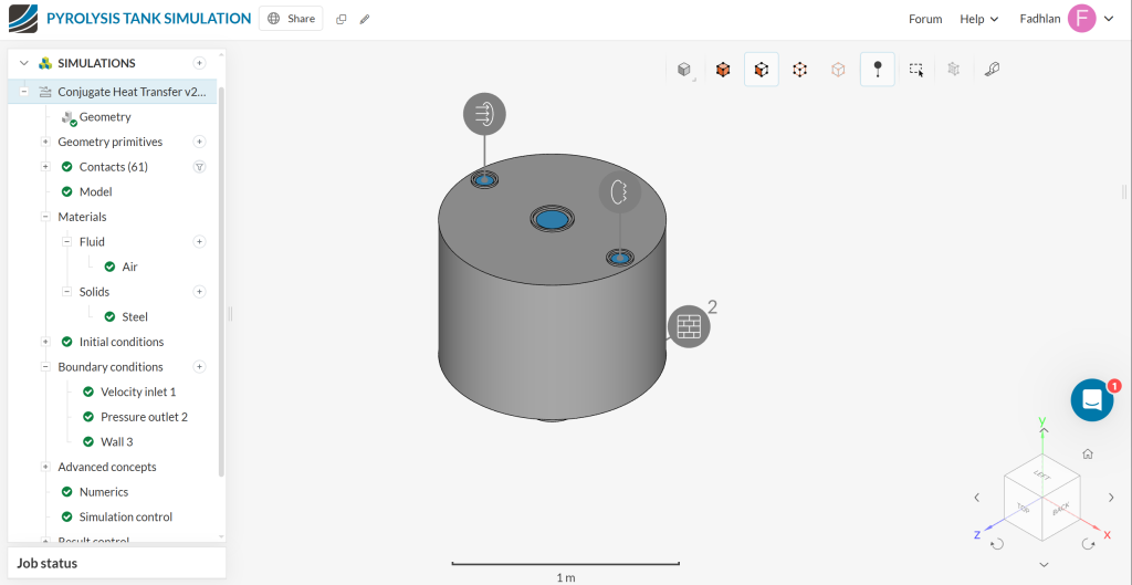 For this project, I designed a 3D model of a pyrolysis reactor with a size constraint of about 1m x 1m x 1m. The reactor is meant to process waste from DAIS cultivation, using heat from a generatorโs exhaust to drive the process. I created the CAD model using Autodesk Inventor 2025 and ran heat transfer simulations in SimScale to analyze how the heat moves inside the reactor. The results will be discussed in the next sections.
