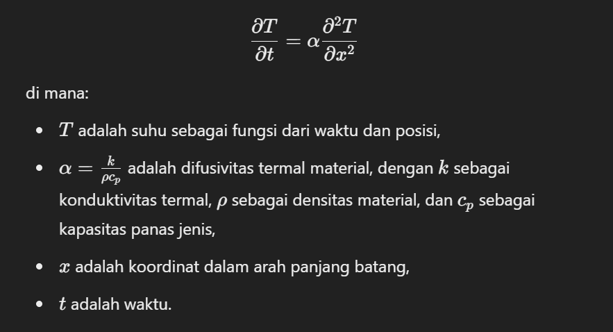 Metode numerik memiliki peran yang sangat penting dalam menganalisis perpindahan panas, terutama dalam memahami konduksi panas satu dimensi (1D). Konduksi panas adalah salah satu mekanisme utama perpindahan energi termal dalam suatu material tanpa adanya perpindahan massa. Proses ini dijelaskan secara matematis oleh Persamaan Fourier Konduksi Panas, yang dalam bentuk diferensialnya untuk kondisi satu dimensi dapat ditulis sebagai: