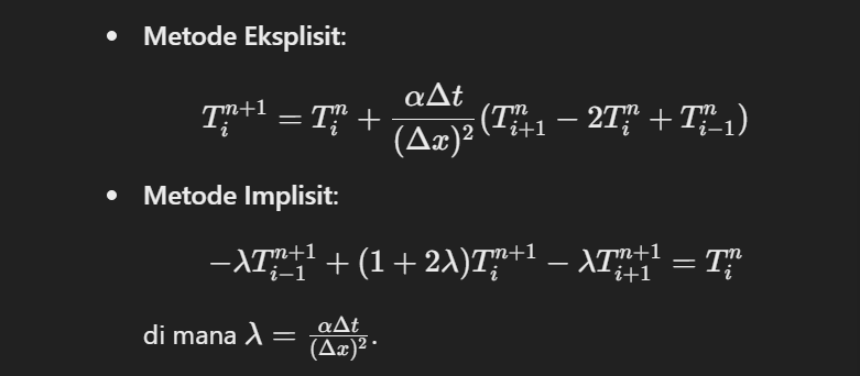 Beberapa metode numerik yang sering digunakan untuk menyelesaikan permasalahan konduksi panas 1D meliputi: