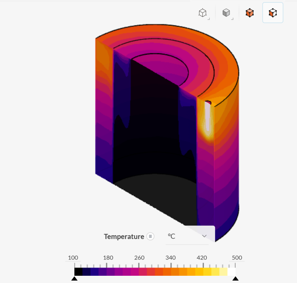 The temperature visualization confirms effective heat transfer, with coolest regions (blue) in the central processing chamber and hottest regions (red) at the inlet/outlet pipes. This temperature gradient powers the pyrolysis reaction while maintaining controlled conditions within the reaction zone.
