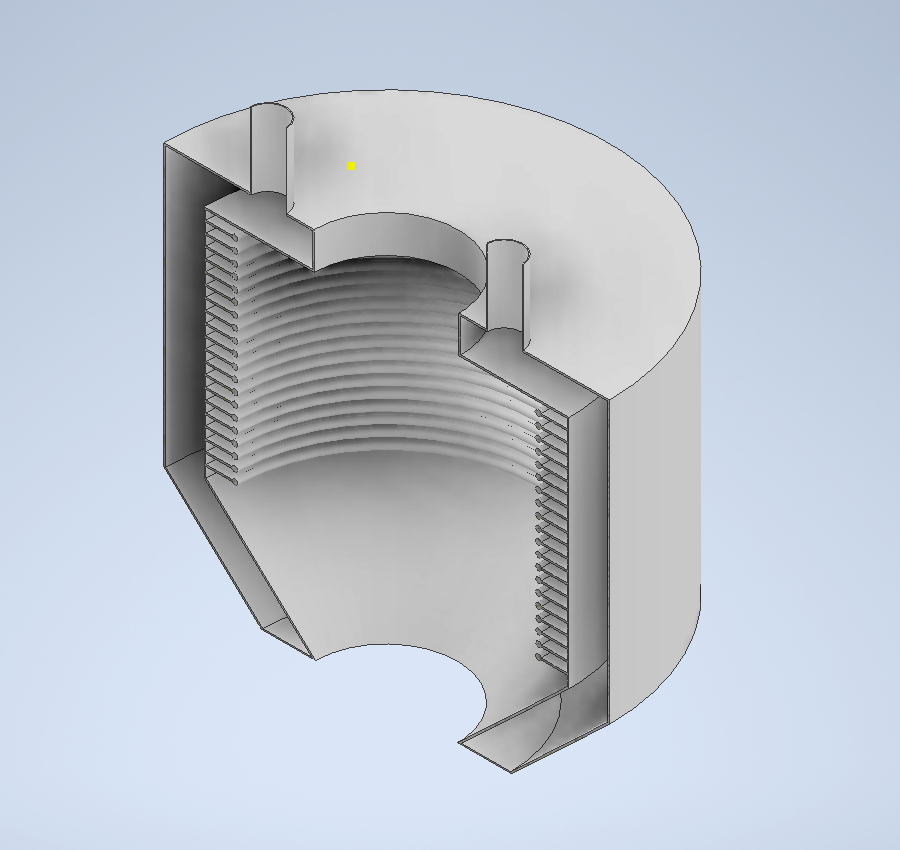 In this pyrolysis machine, heat transfer follows a complex pattern through a multi-chambered heat exchanger design. The CFD visualization shows high-temperature flow entering and exiting the main reaction chamber, with internal baffles creating turbulent flow patterns to maximize thermal contact.