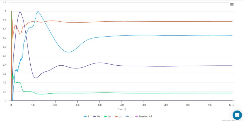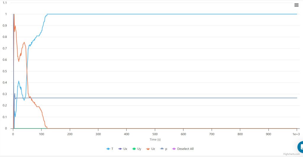 The inlet graph reveals rapid temperature stabilization, reaching normalized value 1.0 within 150 seconds, while axial velocity (Uz) initially spikes before declining to zero. This suggests complete energy transfer from initial momentum to thermal energy within the system.