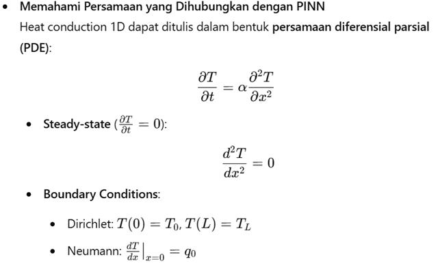 Physics Informed Neural Networks (PINN) dapat digunakan untuk menyelesaikan permasalahan heat conduction 1D dengan menggabungkan konsep machine learning dan prinsip fisika. Framework DAI5 digunakan dalam implementasi ini untuk memahami dan menyelesaikan persamaan diferensial parsial yang menggambarkan penyebaran panas dalam material.