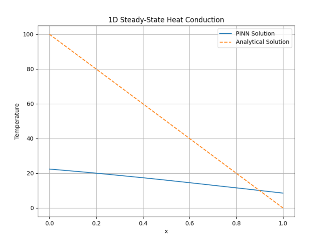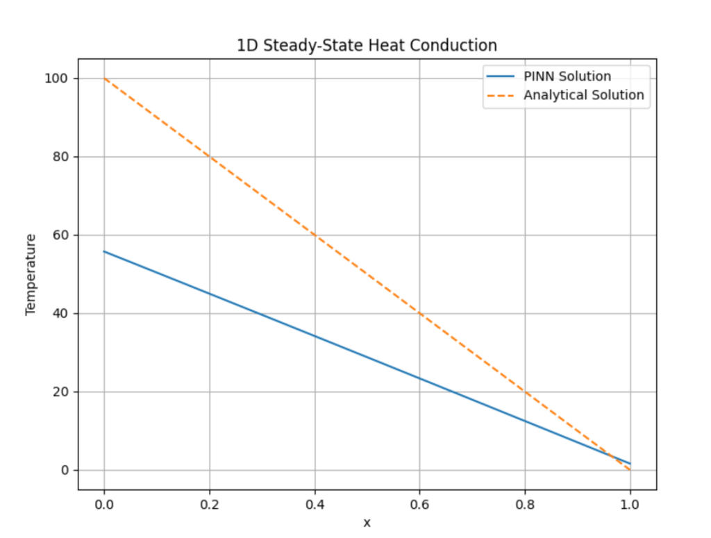 - T_analytical = T0 + (T1 – T0) * x: Menghitung solusi analitik, yang dalam kondisi steady-state adalah profil suhu linier: T(x)=T0+(T1โT0)x T(x) = T_0 + (T_1 – T_0)x T(x)=T0โ+(T1โโT0โ)x.