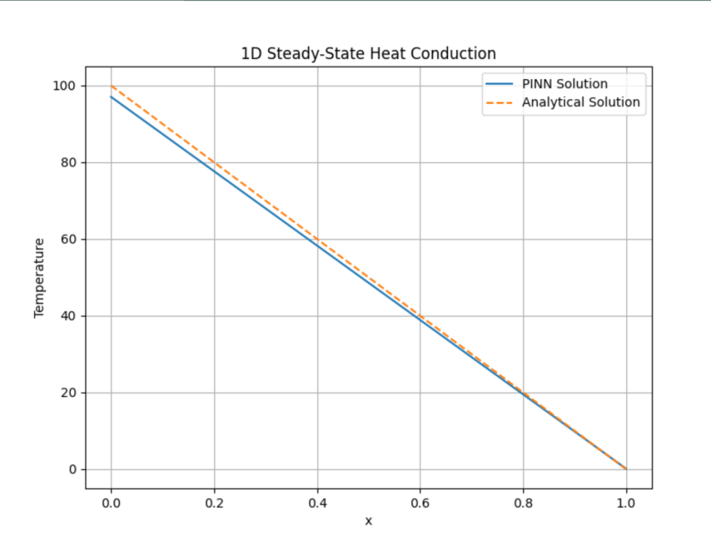 PINN adalah pendekatan kecerdasan buatan yang menggabungkan jaringan saraf tiruan (neural network) dengan hukum fisika untuk menyelesaikan persamaan diferensial, seperti persamaan panas pada heat conduction 1D. Berbeda dengan metode numerik tradisional seperti Finite Difference Method (FDM) atau Finite Element Method (FEM), PINN tidak memerlukan diskritisasi grid, melainkan menggunakan jaringan saraf untuk mengaproksimasi solusi, sambil memastikan solusi tersebut mematuhi hukum fisika melalui loss function. Dalam konteks heat conduction 1D, PINN mengaproksimasi distribusi suhu dalam kondisi steady-state) dengan memenuhi persamaan panas, kondisi batas, dan kondisi awal.