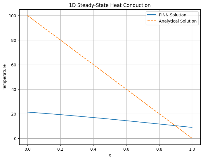 Dalam kasus konduksi panas 1D, misalnya, PINNs dapat digunakan untuk menyelesaikan persamaan diferensial berdasarkan Hukum Fourier, yang dinyatakan sebagai: