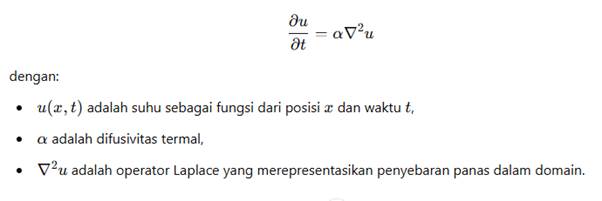 Setelah mendefinisikan jaringan saraf, berikutnya kita harus membuat persamaan heat conduction. Persamaan heat conduction biasanya menggunakan persamaan difusi panas. Rumus yang digunakan dalam metode PINNs adalah: