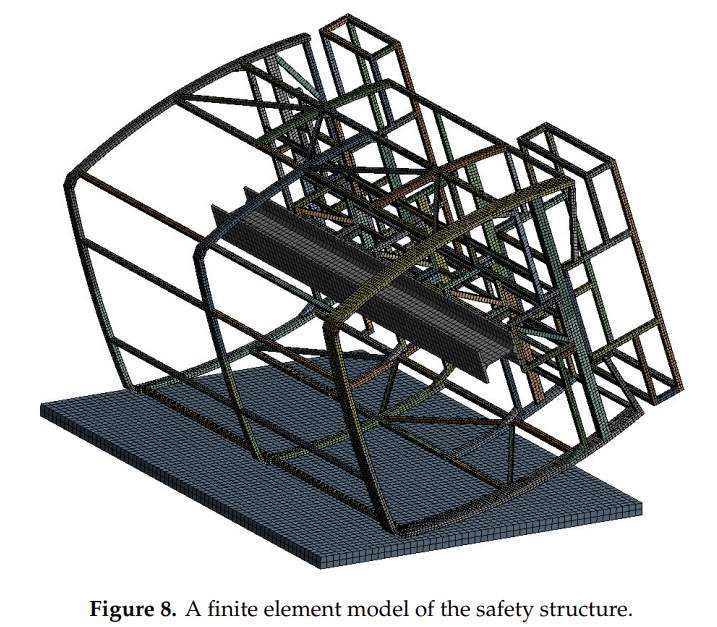 • A three-dimensional base was modeled at an 18.9-degree angle to the vertical plane of the safety frame. This angle is significant for accurately simulating the impact scenario.