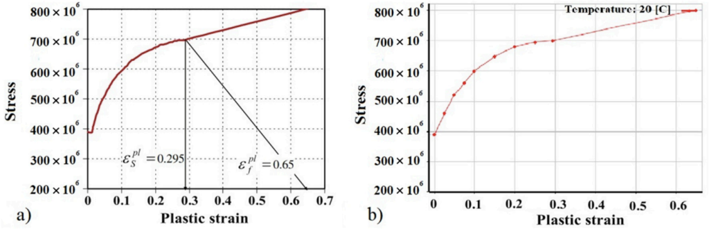 Pertama-tama, dimensi geometri struktur ditentukan, termasuk lebar (b), tinggi (h), dan ketebalan dinding (t). Material struktur ditetapkan sebagai baja struktural homogen dengan modulus elastisitas (E) dan tegangan luluh (ฯƒ yieldโ€‹) berdasarkan kurva tegangan-regangan sejati seperti yang disajikan dalam jurnal.